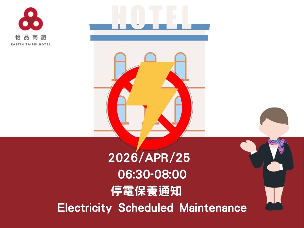 The hotel will be 1.5 hour temporary suspension of electricity supply on 2026/04/25 from 06:30 to 08:00 AM for scheduled maintenance.