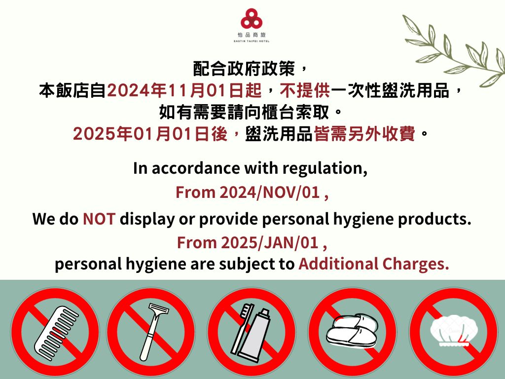 2025 年 01 月 01 日後,不提供一次性盥洗用品,盥洗用品皆需另外收費。