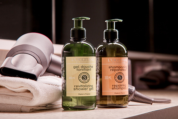 ◎女性專屬公共衛浴,獨立淋浴間乾溼分離,法國歐舒丹(L'OCCITANE)沐浴用品。化妝區配置戴森吹風機(Dyson Supersonic™ Hair Dryer)。